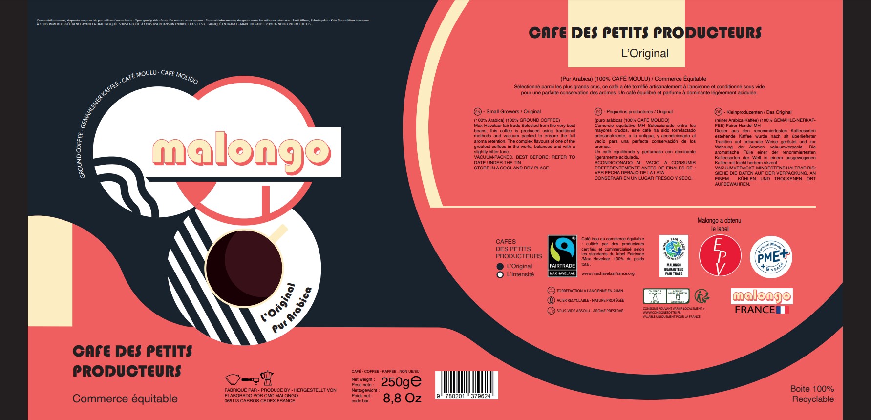 Un autre projet intéressant que j'ai pu réaliser était la refonte et le rebranding d'une boîte de café de la marque Malongo dans le style du Bauhaus.